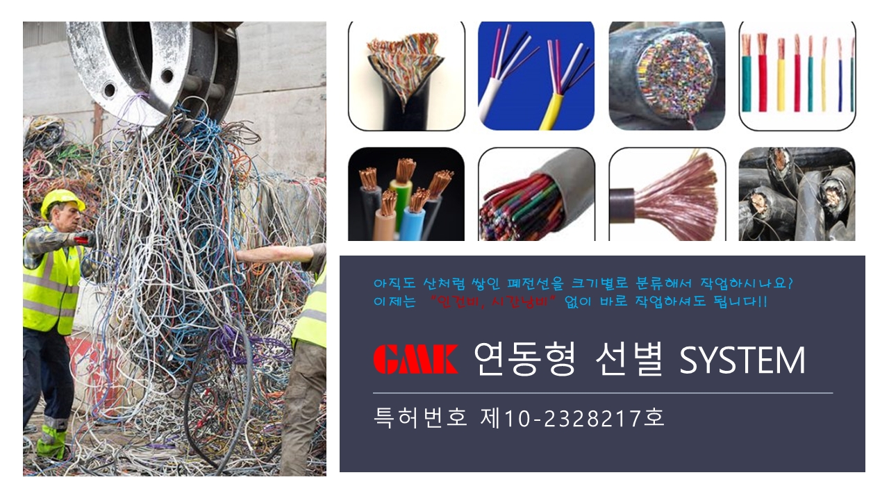 완벽한 구리(동)을 추출 선별하는 획기적인 시스템으로서 폐전선재활용 사업의 편의성을 확대하는 이정표가 될 것이며 전선을 크기별로 분류하는 인건비와